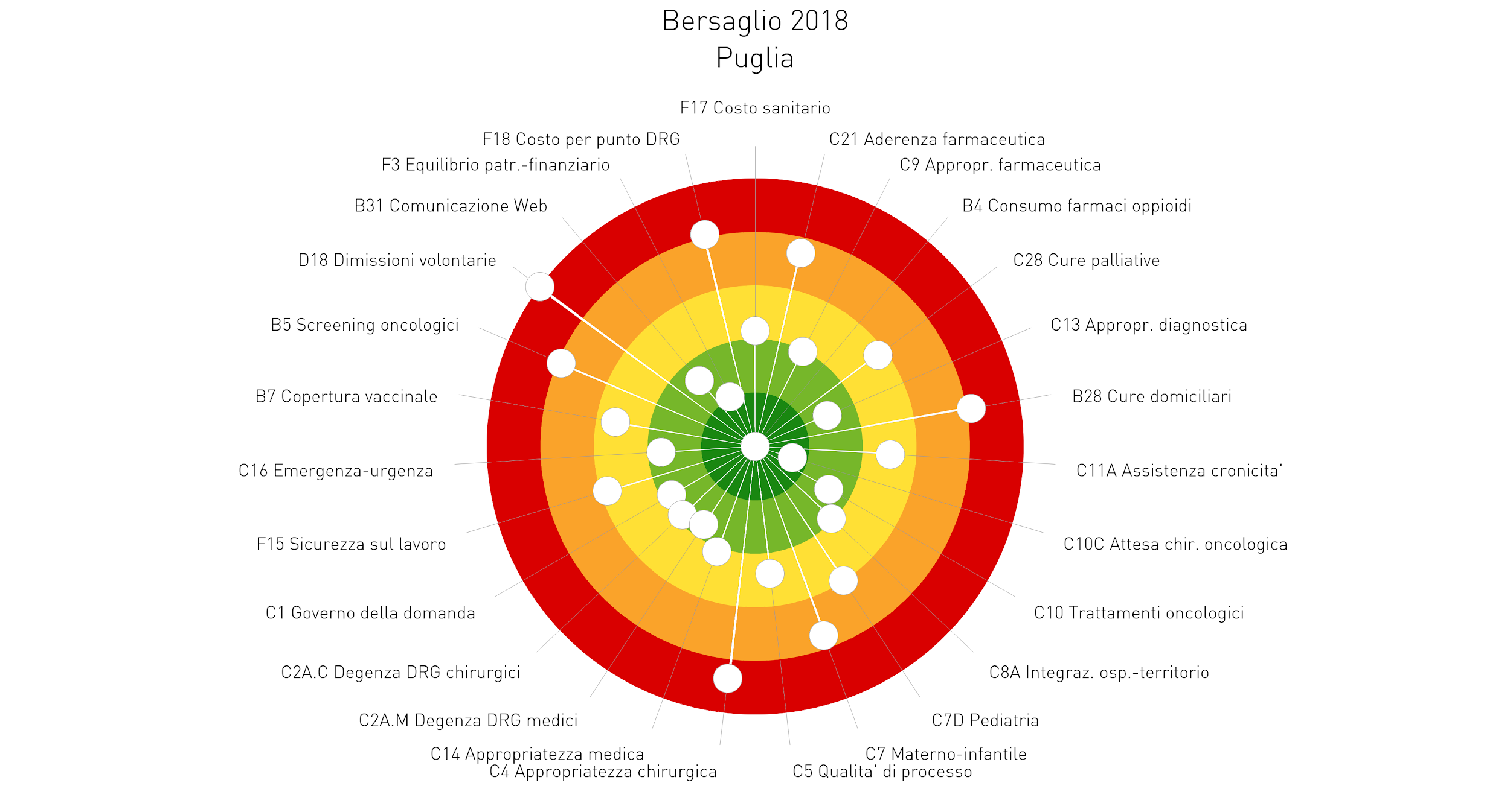Le attività di misurazione e valutazione delle performance riguardano tutte le strutture ospedaliere, pubbliche e private accreditate, che operano sul territorio regionale: gli indicatori prodotti hanno costituito la base per la formulazione degli obiettivi di performance assegnati ai Direttori Generali, in coerenza con le strategie regionali del “Programma operativo 2016-2018” della Regione Puglia, secondo 8 macro-aree: