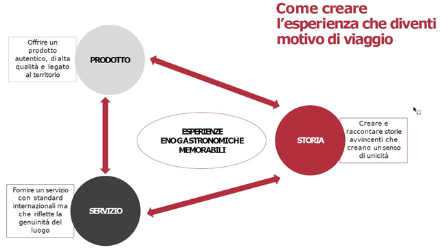 Il turista enogastronomico ama infatti fruire percorsi che includano esperienze diversificate: è quindi auspicabile possedere, tra le offerte dedicate, un ventaglio di esperienze variegato (dalla visita al frantoio al ristorante gourmet, dal corso di cucina tipica al micro birrificio artigianale). Risulta quindi importante valorizzare ad ampio raggio il sistema, che includa sì il prodotto enogastronomico in senso stretto, ma che guardi anche alla connessione inscindibile tra cibo e cultura.